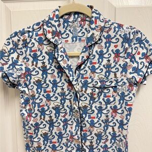 Size XS. White short sleeve button down pajama top with blue monkey pattern and Texas theme. Small chest pocket. Has some pink staining pictured. Priced accordingly.