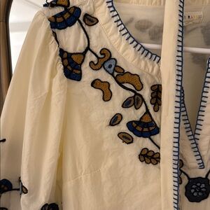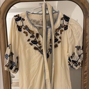 Elegant cream dress featuring intricate blue and brown embroidery. Perfect for any occasion.