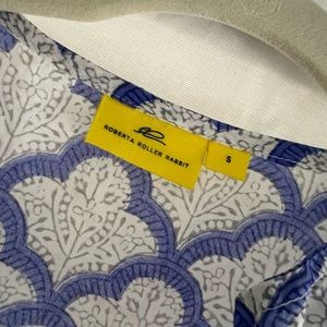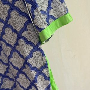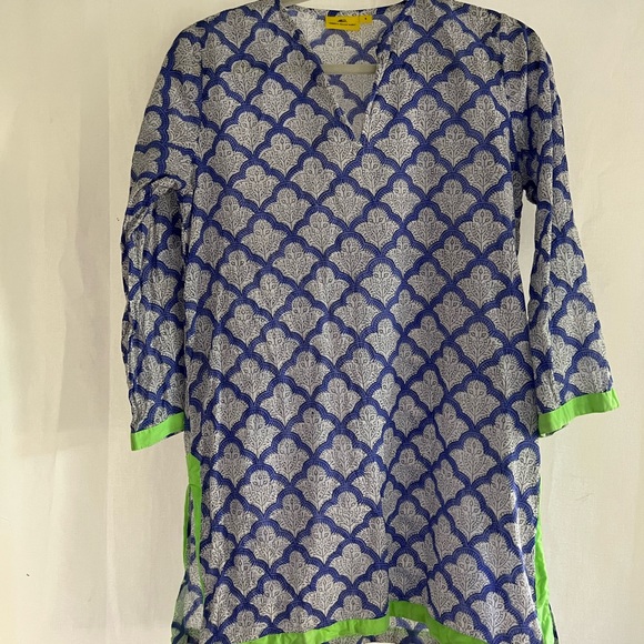 Hand-blocked print in blue with fun neon green trim on hem and sleeves. Perfect for the beach!