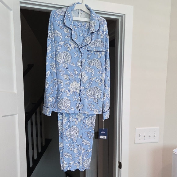 Light blue pajama set with white floral pattern. Button-front top with contrast piping. Matching relaxed-fit pants for comfortable sleep. Soft fabric suitable for restful nights. size medium. new with tags!