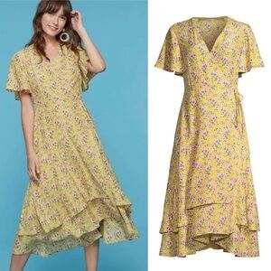 Roller Rabbit Yellow Floral Wrap Dress in size Large. Layered hem at the bottom for a full skirt with a ton of movement. Wide ruffle sleeve matches the bottom and gives the dress a feminine breezy flow. No visible signs of use. No visible flaws.