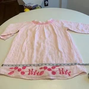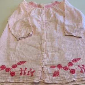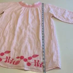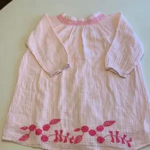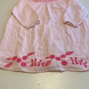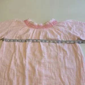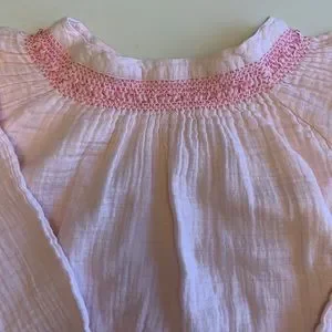 Light pink with dark pink smocking and embroidered flowers.