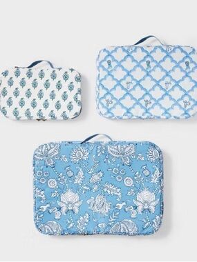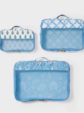Roller Rabbit lightweight packing cubes in coordinating blue patterns. Top mesh panels for breathability and gold tone zipper pulls. Perfect for organized travel packing. Sold out collab.