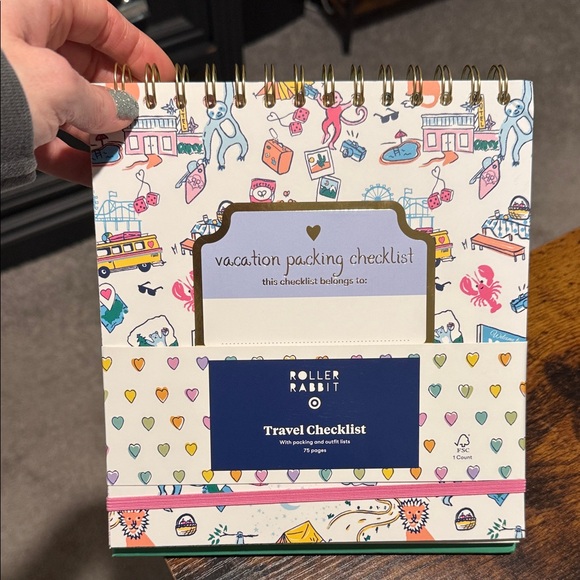 Spiral-bound travel packing checklist by Roller Rabbit. Front features colorful heart pattern and whimsical pastel illustrations. Includes a pocketed front card for name or notes. Cheerful, compact design for organized trips.