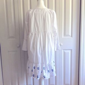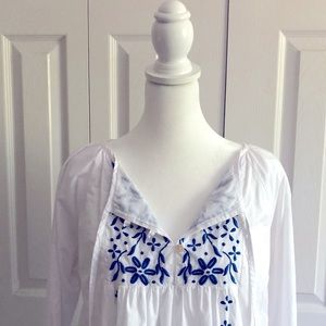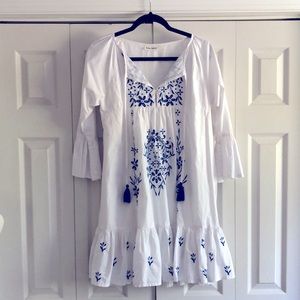 Roller Rabbit blue and white embroidered tunic dress, fits generously for a small. Great condition no stains. Buttons up the front and ties. 100% cotton.