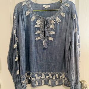 Stylish blue blouse with intricate white tassel accents. Ideal for a casual look.