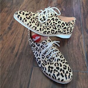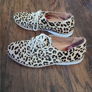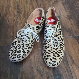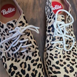 This is a pair of calf hair derby style shoes by Rollie. They have leopard print and a white low heel.
