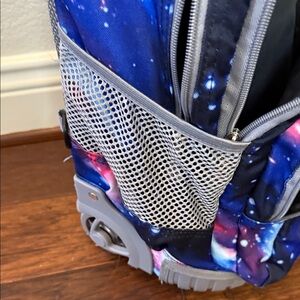 Gently used - 17” rolling backpack with multiple pockets and padded laptop area. Has side pockets on both sides and backpack straps that can be tucked in (as shown on back) or pulled out to use as a backpack. Also has adjustable rolling handle.