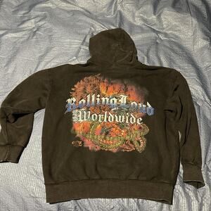 Charcoal zip up rolling loud hoodie. Made from a heavyweight cotton, the zip up hoodie is plain on the front and features a rhinestone design on the back. Exclusive from the 2024 Rolling Loud Music Festival in LA.