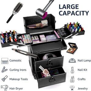 Muti-functional & Large Capacity Cosmetology Case on Wheels: The first layer of cosmetology Case features a nail polish bottle slot with dividers that can hold and protect 45 nail polish in an upright position or remove the dividers to hold large beauty supplies. The top lid also has a makeup pouch to put makeup brushes and other cosmetic supplies and 2 large sliding drawer has great storage for flat/curling iron, sprays, palettes, and other items in relatively big sizes.