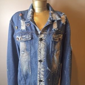 Distressed and splashed painted jean jacket. Upscaled with hand painted peace sign.