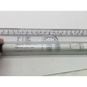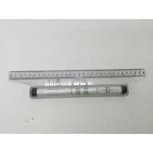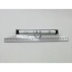 -Clear plastic ruler with wheels that allow you to draw circles and arcs, draw angles and crosshatching