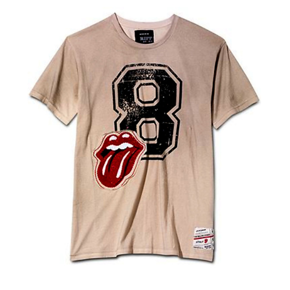 Special edition 50 Years of Rolling Stones Beige Dyed T-Shirt from Riff Stars. 8 Super Lick with embroidery Tongue Logo patch image and with special patch on the left lower side of the shirt, 100% cotton. Great gift for any Rolling Stones fan.