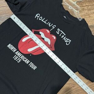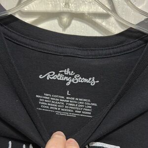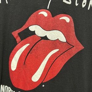 Black t-shirt featuring Rolling Stones graphic with red tongue design. Good Preowned condition.