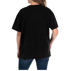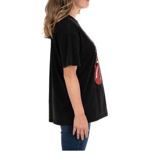 Black t-shirt featuring a Rolling Stones graphic with bold red lips and green accents.