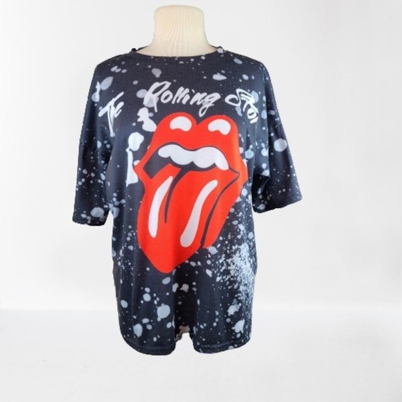 A bleach spattered design black tee shirt with the classic Rolling Stones logo.