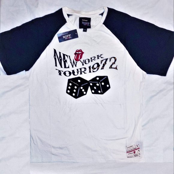 Special edition 50 Years of Rolling Stones Raglan white and black T-Shirt from Riff Stars. Black Velvet dices, Tongue Logo image and New York Tour 1972, with special patch on the left lower side of the shirt, 100% cotton. Great gift for any Rolling Stones fan.