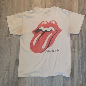 Rolling Stones graphic tee size medium . Creme colored t-shirt. Vintage look. Model pic just to show style and fit, actually t-shirt is the creme colored one