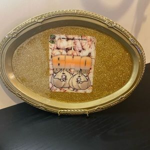Gold oval rolling tray with decal, comes with ashtray and stash jar.