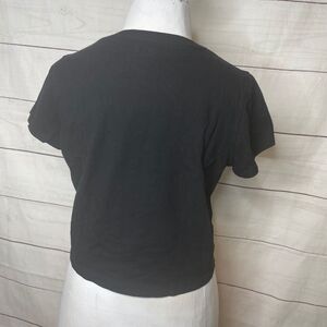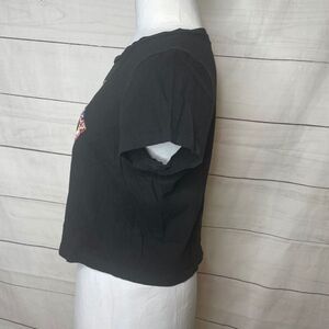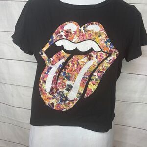 Rolling Stones by Bravado black crop top. Signature Rolling Stones mouth tongue logo on front in a floral pattern. Cute rocker concert tee