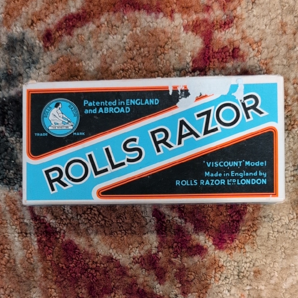 Rolls Razor Viscount Model in blue and black. Made in England.Instruction Manual and other things inside the box. Stainless steel case with razor with strap and houn. Would be a nice piece to add to a collection.