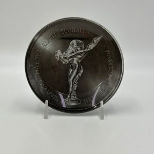 When you get home and need a place to put your pocket change, this is it. Only Rolls Royce would think of something like this for the perfect gentleman. The dish is 4.5" in diameter and features THE SPIRIT OF ECSTACY in the center. It is back painted glass and in very good condition for its age since it is a vintage piece. There is a very small piece of missing paint as shown in the photo on the obverse and a tiny dot between the spirits legs. Other than that, it is in great condition. I actually used the dish for my Wraith key, so it can be used for a variety of things.