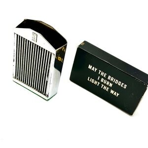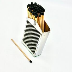This is a very cool match striker from Rolls Royce that resembles their iconic grill. It holds midsize wooden matches which I will include. The striker looks great on a home bar or in a man cave. It's always good to have a match at-the-ready! I acquired this from a classic car aficionado at least 25 years ago. It stands 4 inches tall without the matches. It's 2.5" wide and an inch thick. I'm unsure of its composition, but since it has never peeled I am guessing stainless steel. A point worth mentioning is the black enameling is worn in a few places between the grill bars commensurate with age.