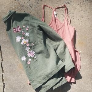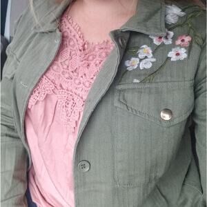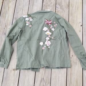 So cute and perfect for a lightweight spring or fall jacket! Beautiful floral embroidery. Button up. Upper snap pockets and lower slash pockets. Collared. Long sleeves.