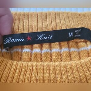 Chic striped sweater in mustard and white. Features a classic crew neck. Ideal for casual wear.