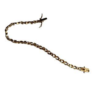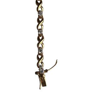 This elegant gold plated bracelet adorned with sparkling rhinestones will elevate your style. Its intricate design and shimmering stones catch the light beautifully, adding a touch of glamour to any outfit. The secure clasp ensures a comfortable fit, making it a stunning accessory for any jewelry collection. In great condition.