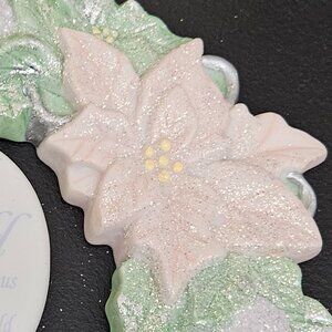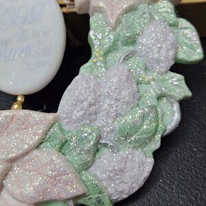 Porcelain Wreath with Pale Pink Poinsettias , Green Holly and Pale Purple Grapes, Covered in Glitter