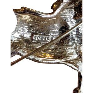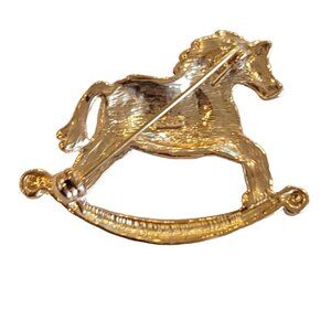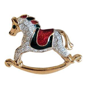 This brooch features a rocking horse design with red and green enamel accents, embellished with clear pave rhinestones. It is crafted with gold-tone metal and measures 1.8 inches in width. The back is ROMAN, with a secure locking pin with a mechanism that works perfectly well.