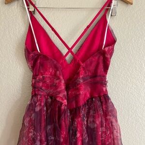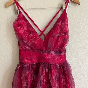 •Woven organza, with a red and ivory floral print, shapes this dress that has adjustable straps that crisscross at the open back, a deep V-neckline, and a fitted bodice
