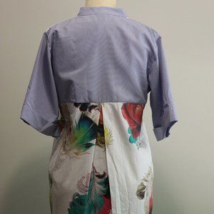 Beautiful 100% cotton dress by Romance Was Born in a size 6. Dress is blue and white with a colorful feather print. Sleeves are wide and cuffed for easy movement, and the dress is lightweight and perfect for warm weather. It has beautiful pleated back detailing and a partially split front than can be buttoned or left open. Dress is in excellent condition.
