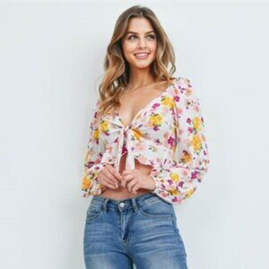 This top is giving us such romantic vibes! Our Romance is in the Air Floral Crop Top stuns with its ivory base and florals in pink & yellow, raspberry. The v-neckline and long sleeves make it so sweet. Style with a pair of our Distressed High Rise Denim or with our Demin mini skirt.