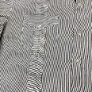 The Romani Collection Vintage 70s Quad Pocket Micro Stripe Shirt is a classic button down shirt in excellent condition. The shirt is made with a distinct grey striped pattern and boasts four pockets, making it a perfect choice for classic, vintage style. This shirt is available in men's size large.