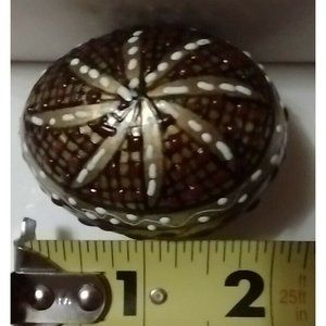 This is one of many Romanian Pysanky hand painted real Easter egg in multi-color patterns that I have listed. This one has a gold background. The egg painting accents in red and white are pronounced in extra thick paint giving a 3D mosaic effect. The design on front and back is a white dotted pinwheel. Side details are borders with a red vine design. A very beautiful and collectible decoration!