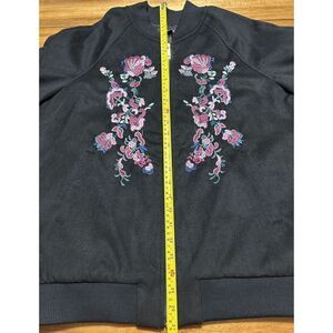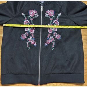 Roman's Women’s Black Floral Embroidered Bomber Zip-Up Jacket Size Medium 14/16W. See photos for measurements.