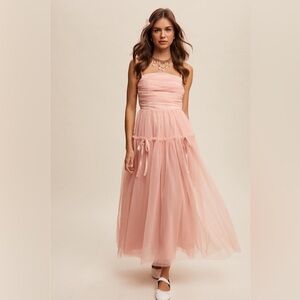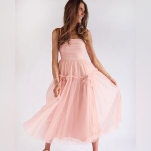 Keywords for Search: romantic pink dress, tulle midi dress, ribbon tie dress, feminine blush dress, ethereal wedding guest dress, soft pink flowy dress, whimsical prom dress, cottagecore midi gown, pastel party dress, dreamy fairy dress