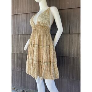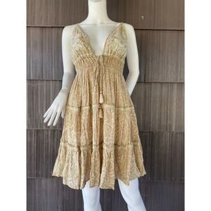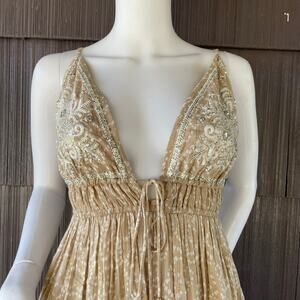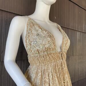 š„Romantic Bohemian Cottage Plunged Neck Sequins Metallic Gold Lurex Tan Dress M-L