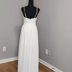 Dress features a fitted bodice with delicate floral appliques and plunging neckline. It has thin spaghetti straps that add a touch of simplicity and elegance. The skirt is made of flowing chiffon, which creates a light and airy look, perfect for a beach or garden wedding. The skirt also has a high slit, adding a contemporary and chic element to the design.