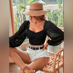 Romantic Flair: Swiss Dot Ruched Bust Frilled Lantern Sleeve Crop Blouse