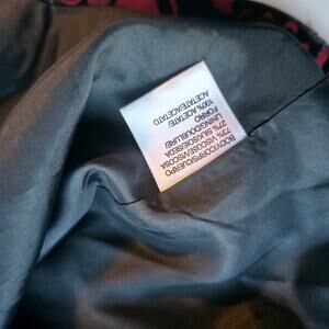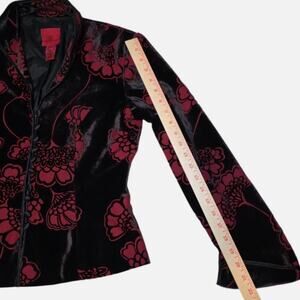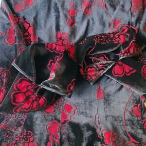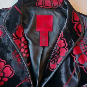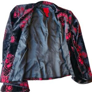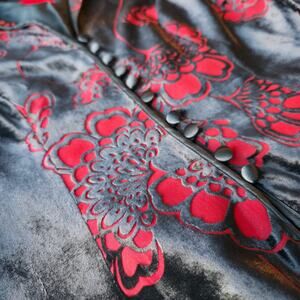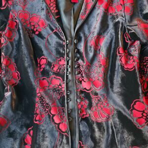 A dramatic JS Collections velvet burnout jacket steeped in romantic goth elegance. Crafted in rich black velvet with deep red floral motifs, this piece catches the light with a subtle sheen, creating a moody, almost candlelit effect.
