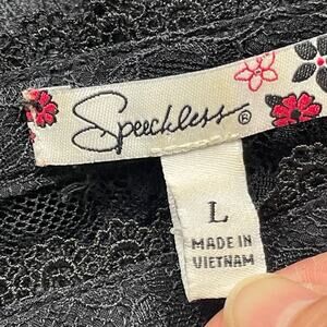 Exquisite Speechless black lace blouse featuring delicate floral patterns and romantic detailing throughout. This sophisticated piece is completely see-through, showcasing feminine ruffled short sleeves and scalloped hem edges for an elegant touch. The transparent design offers versatile styling possibilities while the convenient back button closure provides a secure fit. Perfect for evening occasions when layered over a camisole or bralette, or dressed down with jeans for a high-low contrast look. The Victorian-inspired silhouette creates a timeless appeal that transitions effortlessly from office to dinner. This size L top embodies gothic romance while remaining incredibly wearable, making it a standout addition to any fashion-forward wardrobe. The sheer fabric allows for creative layering options.