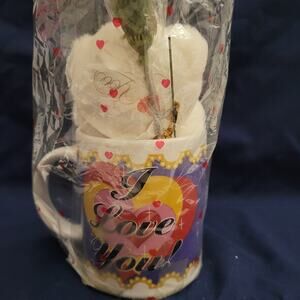 Express your love with this charming coffee cup! Featuring a sweet white teddy bear hugging an "I Love You" pillow and a beautiful red rose.