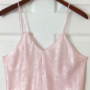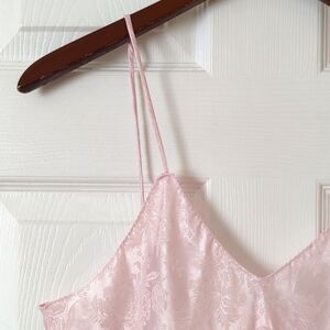 VTG and straight out of the 80s - This beautiful dainty tank slip dress features a sleeveless silhouette with spaghetti straps, a v-neck, and a curved split hem. It has a loose, relaxed fit and a mini length. It is composed of a floral brocade material that is baby pink in color! It's super soft, lightweight and breathable creating a flattering silhouette that is perfect for Spring and Summer. Great for warm weather! Very simple, classic, nostalgic and elegant. Chic, retro and high quality!
