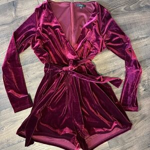 From Lulu’s website: Lulus Exclusive! Let your your heart lead you to the dance floor in the Romantic Moves Burgundy Velvet Long Sleeve Romper! Soft and stretchy velvet shapes a darted, surplice bodice framed by fitted long sleeves. Tying sash accents the waist above relaxed