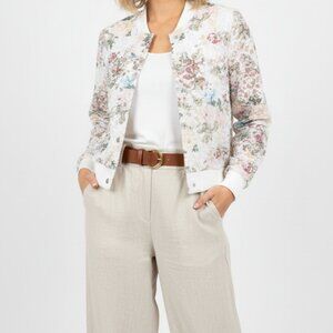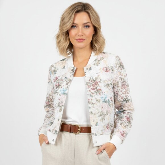 This Nanette Lepore jacket is more than just a piece of clothing; it's an expression of style. The intricate lace and lively floral design add a touch of romance and elegance, while the comfortable bomber style ensures effortless wear. Whether you layer it over a simple tee and jeans or pair it with a sleek dress, this jacket promises to be a versatile and cherished addition to your collection. Don't miss out on this charming and sophisticated piece!