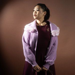 Express your romantic self with this oversized lilac sweater featuring gorgeous lace ruffles.