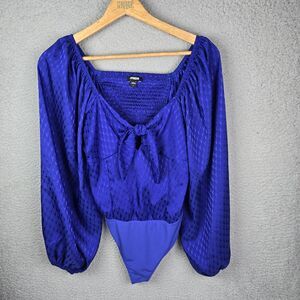Invite compliments in this coquette romantic blouse bodysuit, size L, in luminous blue satin with all the trendsetting details: puff sleeves, a charming keyhole bow, and an on-or-off shoulder neckline that flatters all shapes. Smocked back detailing offers comfort and a flexible fit, while the unforgettable color and silhouette put you ahead of every aesthetic curve—regencycore, boho, romantic, and festival-ready.